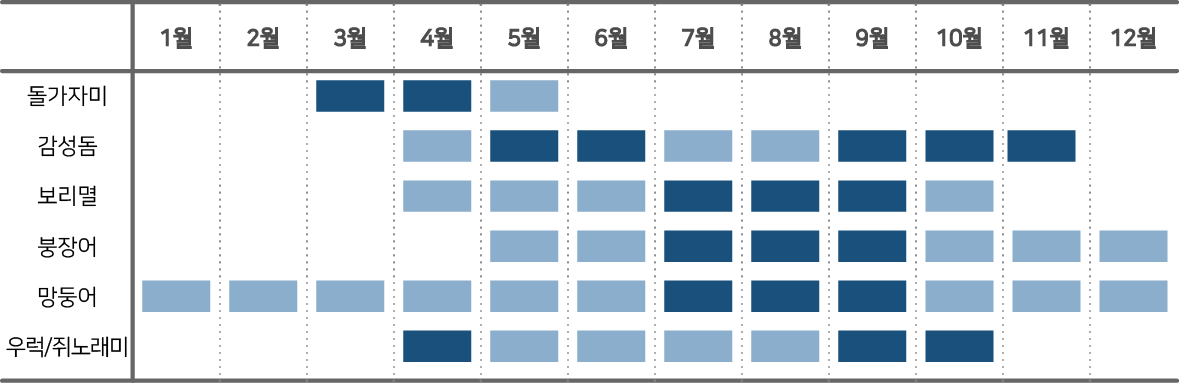 대상 어종과 지역별 시즌에 대해서 알아보도록 하겠습니다.