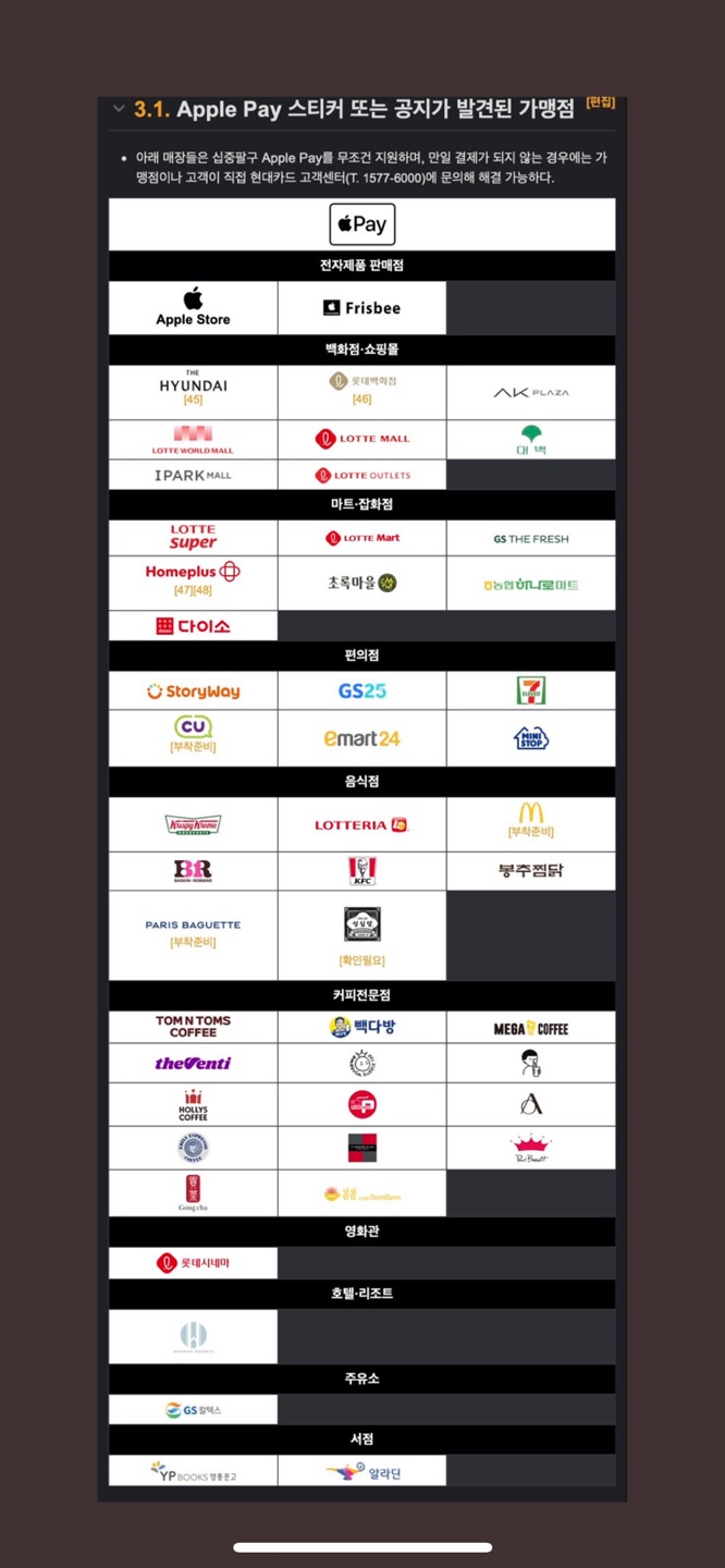 애플 페이가 공식적으로 사용가능한 가맹점은 아래 사진과 같습니다.