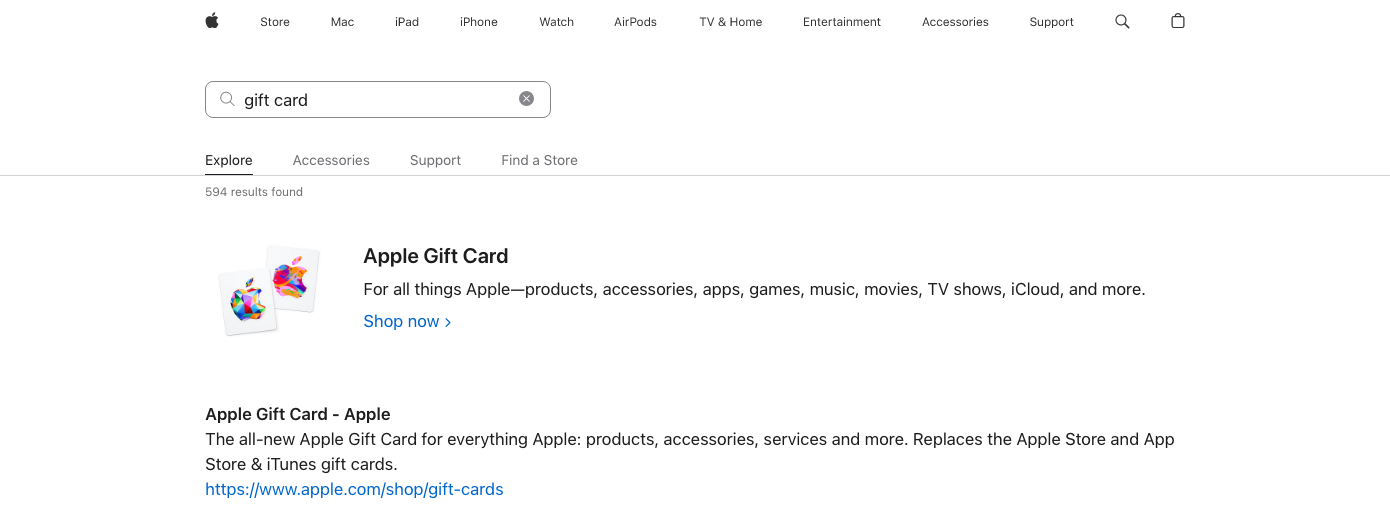 애플 홈페이지 우측 하단을 보면 나라를 변경할 수 있습니다. 여기에서 미국으로 변경을 하고 검색을 하는 곳에 "gift card"로 검색을 하면 아래 사진과 같은 검색 결과가 나옵니다. 여기에서 첫 번째 검색되는 페이지를 선택하면 구입을 할 수 있습니다.