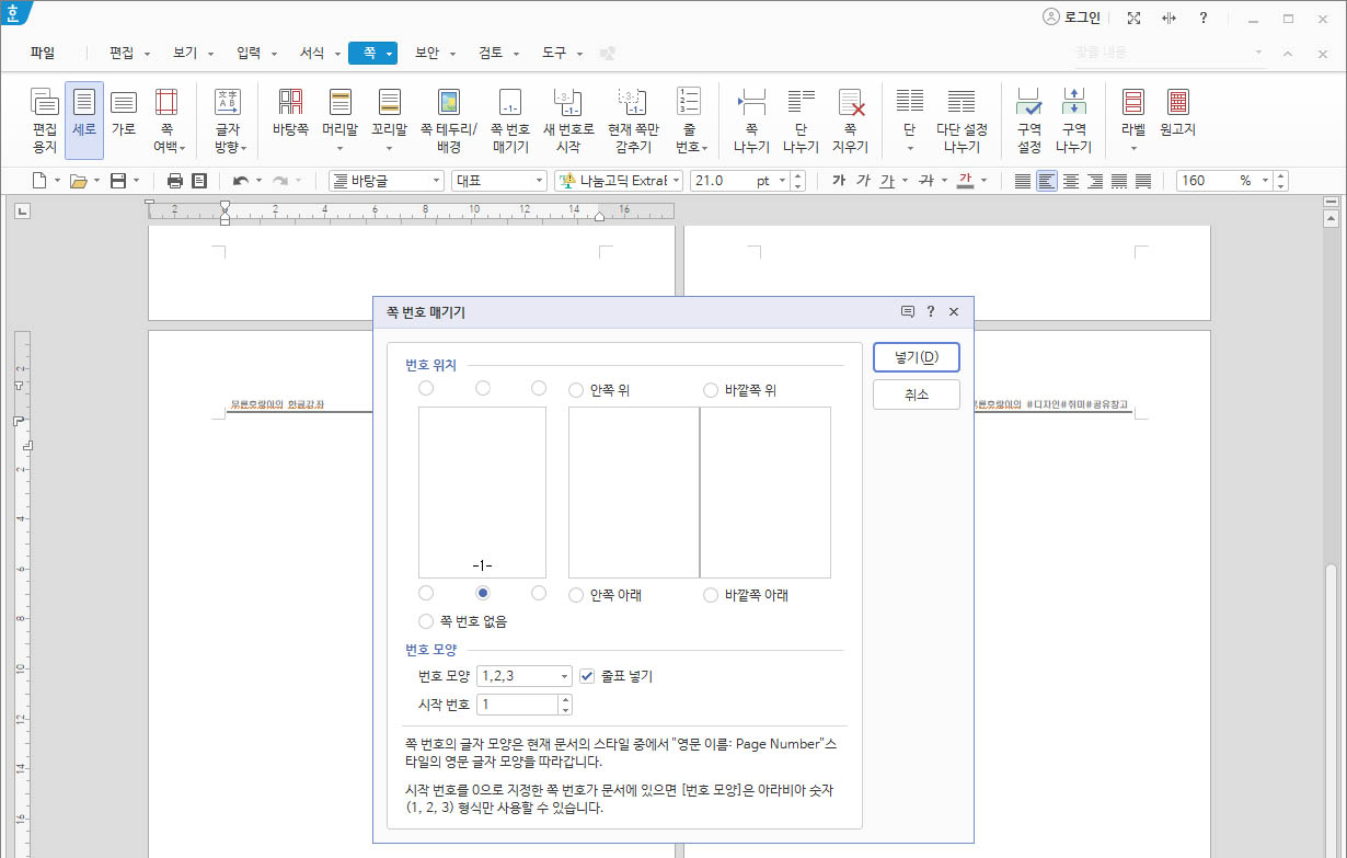 한글과 컴퓨터 머리말, 꼬리말, 원하는 위치에 쪽번호 넣는 방법 |