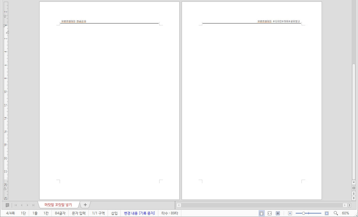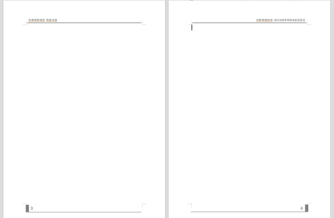 저는 이렇게 홀수 쪽과 짝수 쪽을 각각 문구를 다르게 하여 꾸몄습니다. 한글의 표를 사용해서 아래와 같이 꾸밀 수 있습니다.