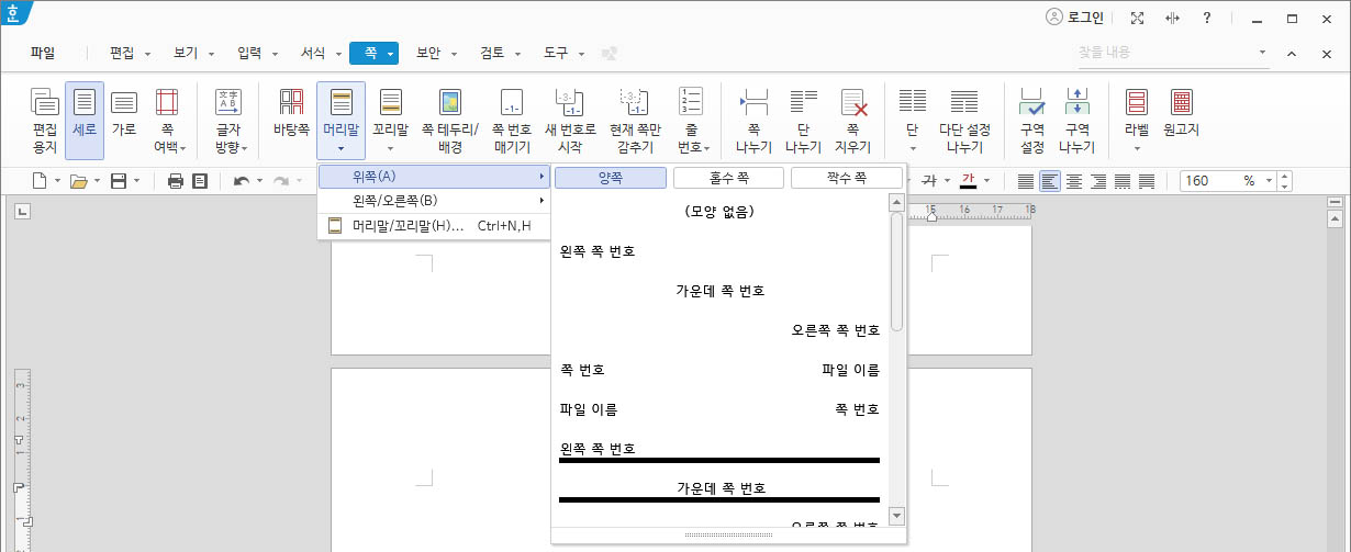 - 양쪽 : 양쪽 동일하게 머리말을 삽입할 때 사용합니다.