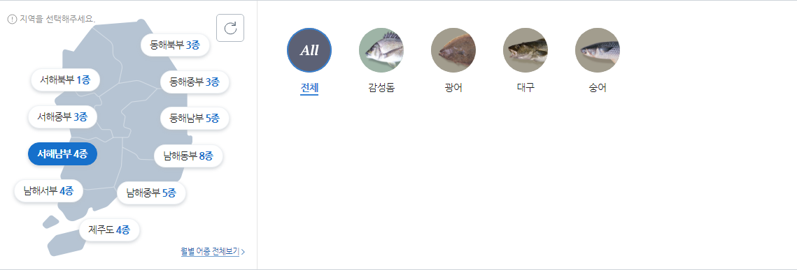 남해권은 확실히 잡을 수 있는 어자원이 많은 축복받은 지역인 것 같습니다. 남해 서부에 우럭이 잡힌다고 나와있지만 남해서부 쪽에서 낚시로 우럭 포인트를 찾기가 쉽지 않을 것입니다. 그보다는 학꽁치, 붕장어 등을 공략하시는 것을 추천드립니다. 그리고 남해 중부와 동부 쪽에서는 농어, 도다리, 무늬오징어, 벵에돔, 볼락, 우럭, 호래기가 보입니다.
