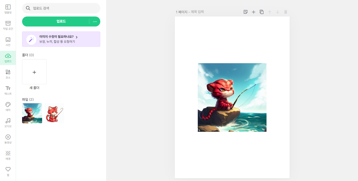 2) 왼쪽 메뉴에서 업로드 버튼을 선택하여 Bing Image Creator로 그린 그림을 불러옵니다.