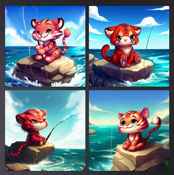 저는 "바다가 보이는 귀여운 붉은색 호랑이 캐릭터가 낚시를 하고 있는 모습의 디지털 아트"를 그려달라고 번역을 해서 요청을 해보도록 하겠습니다.